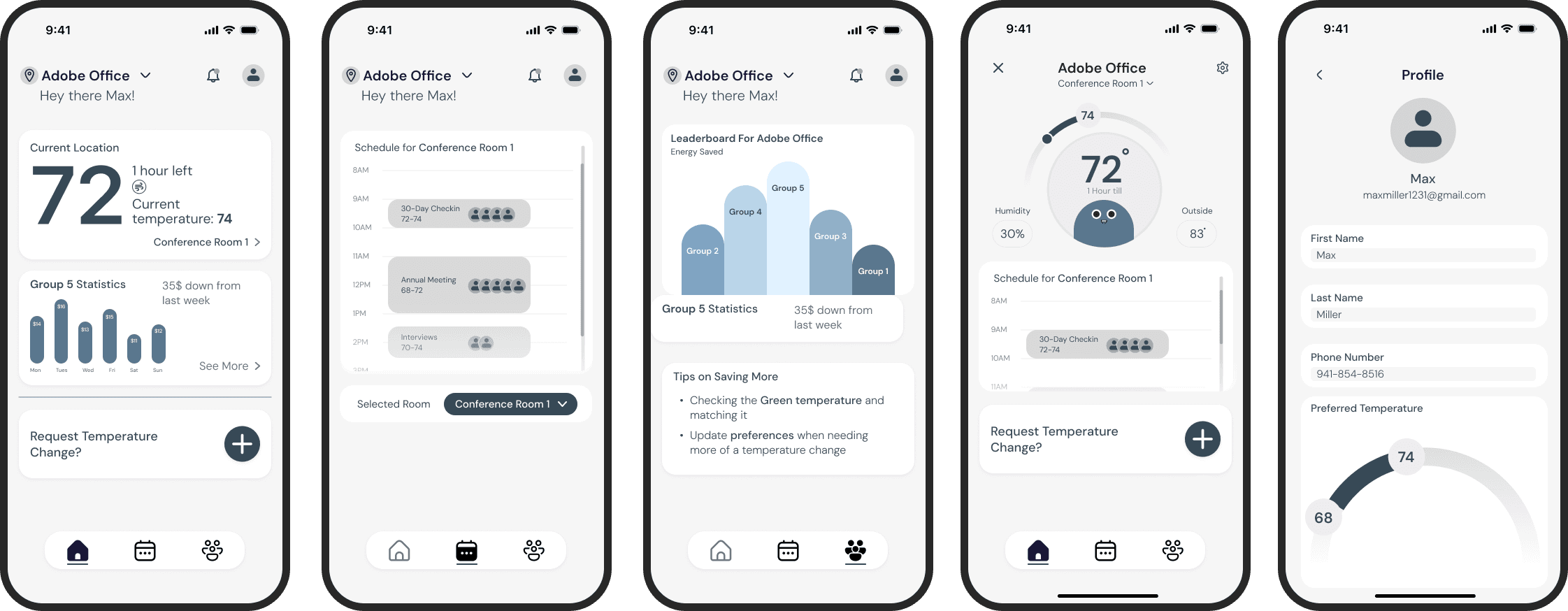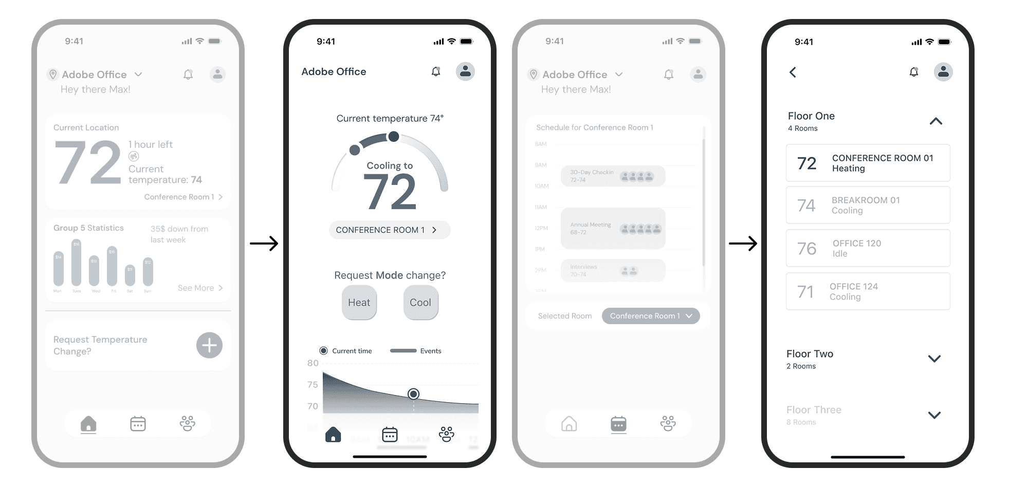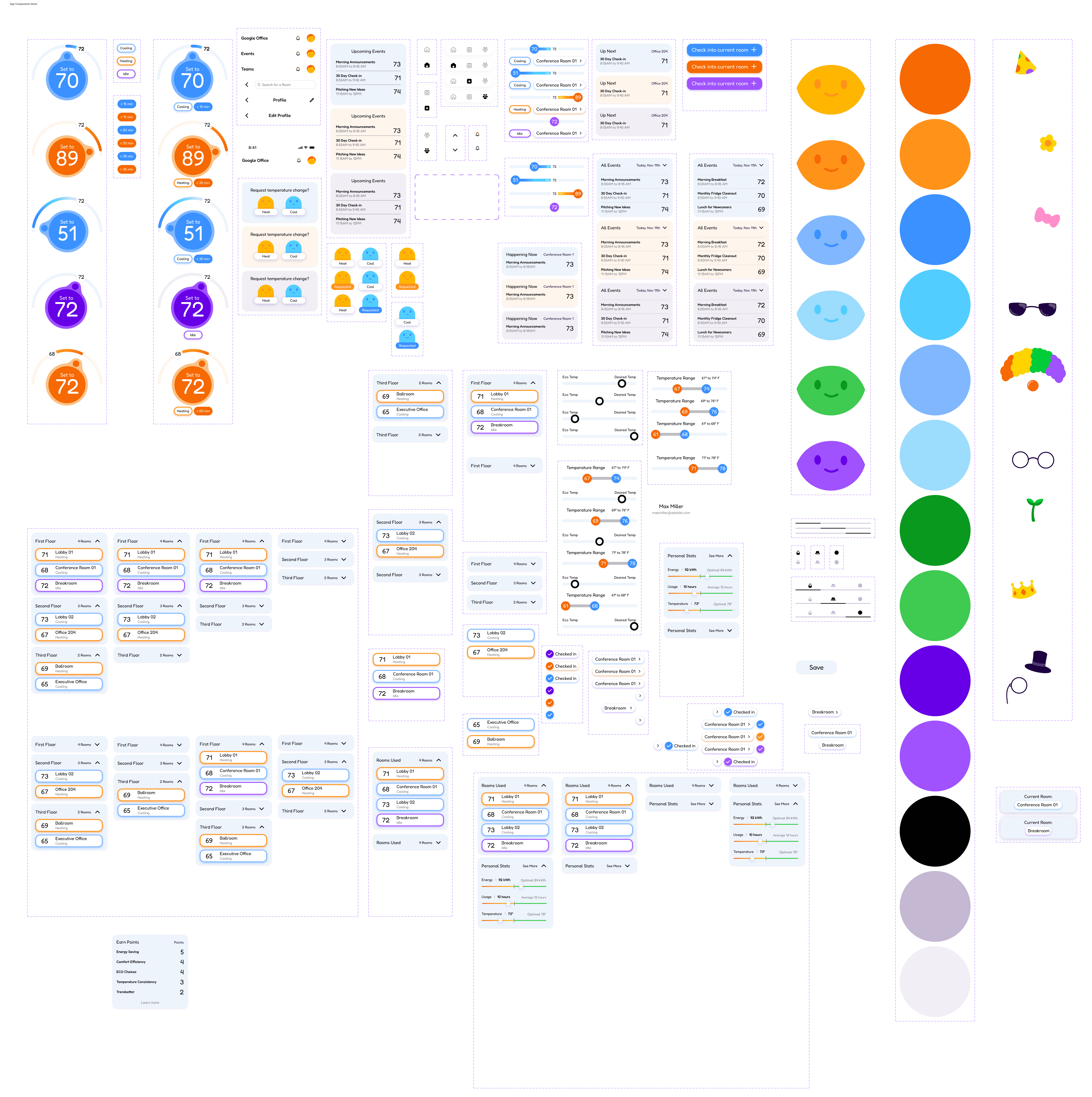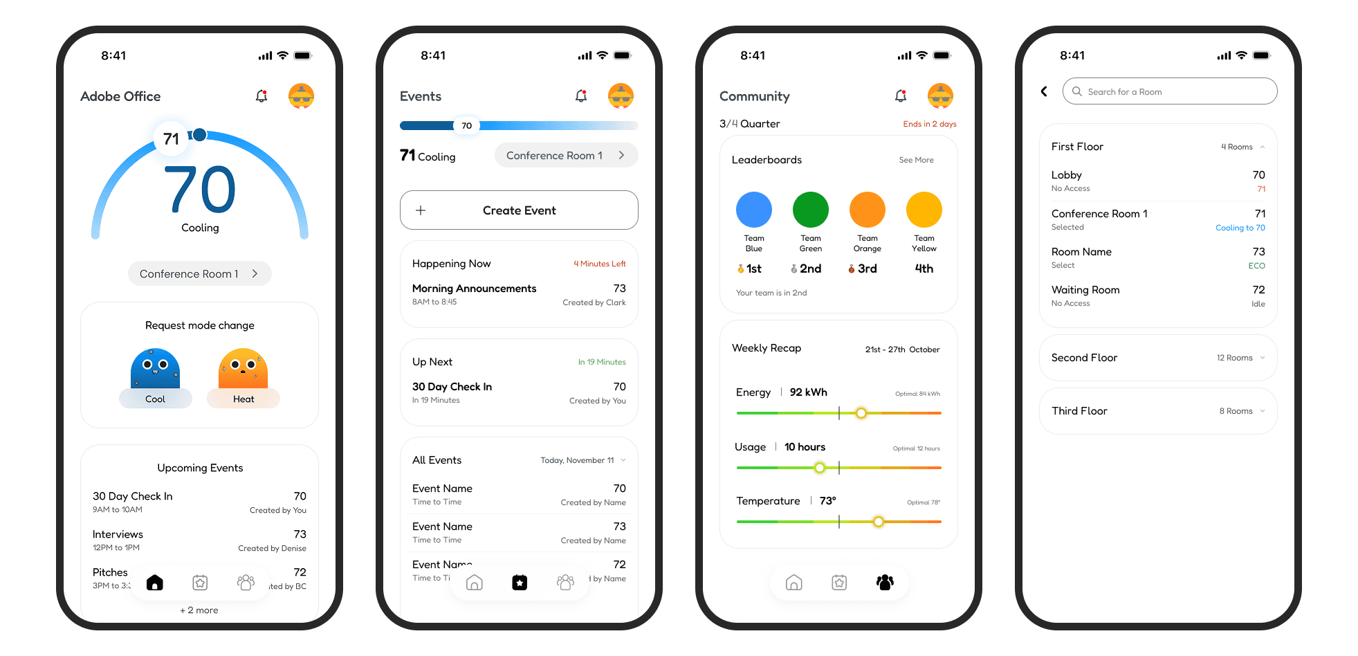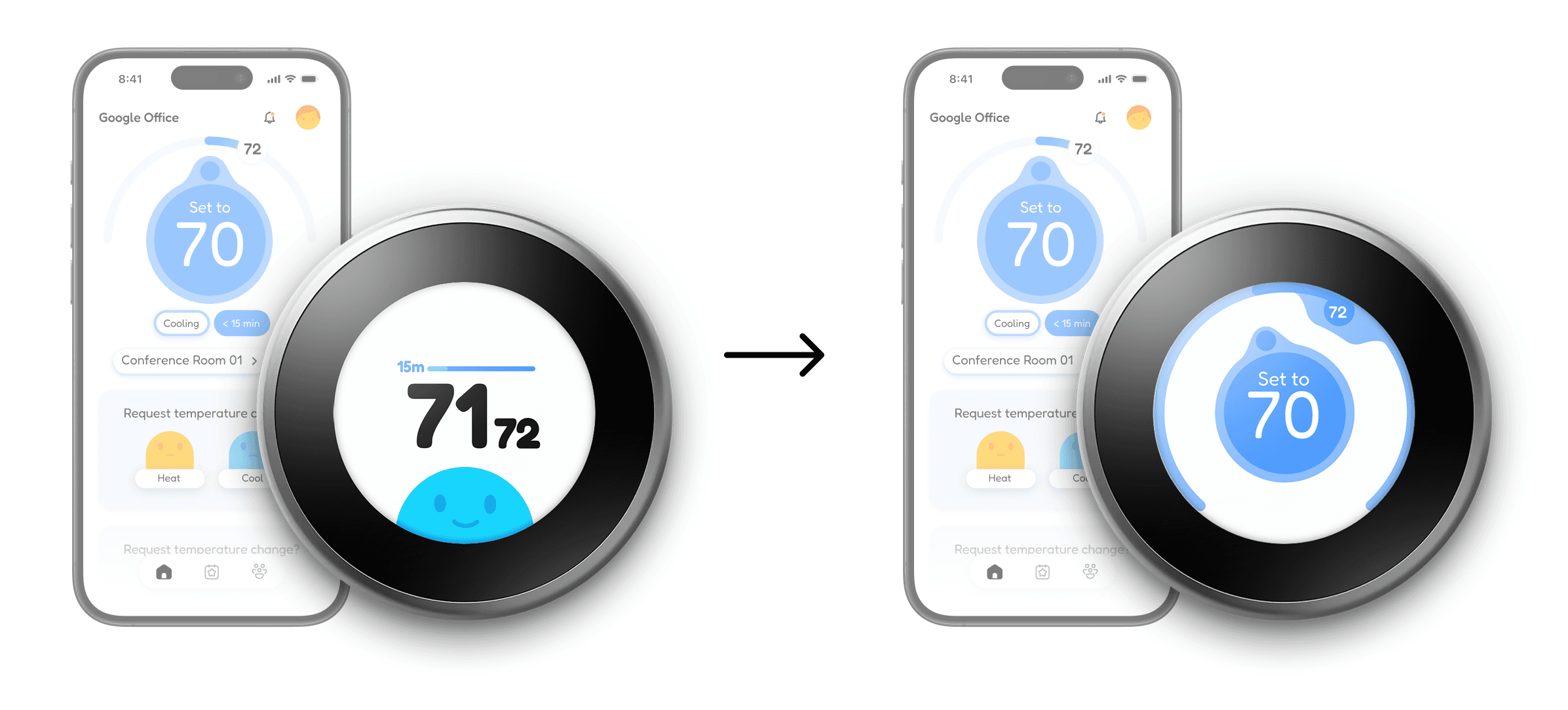 The temperature in the office often an issue, making teams feel disconnected and out of their control. Most thermostats like the Nest aren't built for shared spaces, leading to this discomfort. This redesign reimagines in a "friendly and cheerful" way how the office thermostat can promotes collaboration, teamwork and all around connectedness in the office after the pandemic. Room layouts enable targeted control based on the current location of the room blending with the environment seamlessly. The result is a temperature controlled system that created a shared enjoyable experience for everyone in the office.
